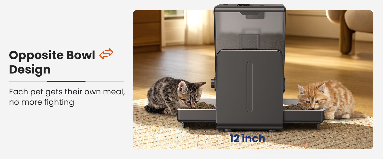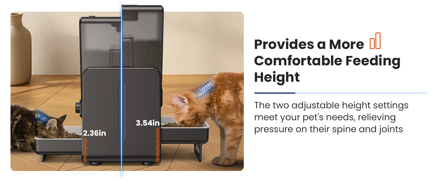 - Adjustable Height & Dual-Bowl Comfort: Two height options (2.36/3.54 inch) of pet feeder help reduce strain on your cat’s neck and joints. The 12-inch bowl spacing allows two cats to eat side by side comfortably - no more food fights, just peaceful, stress-free mealtimes
