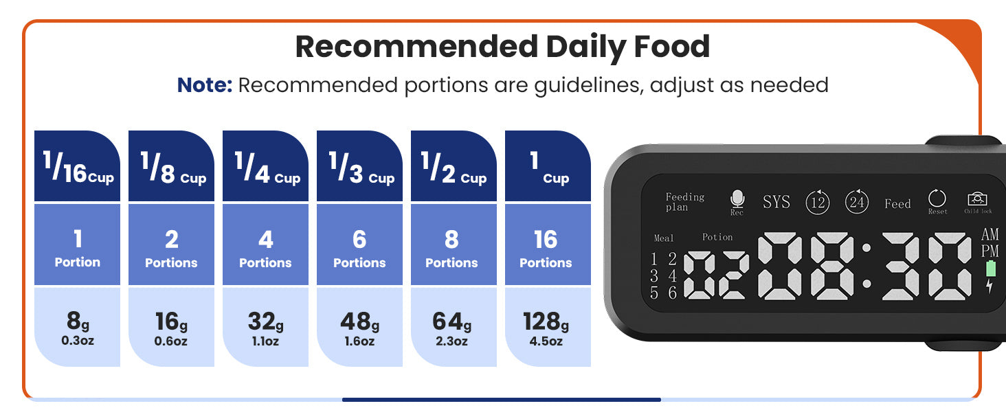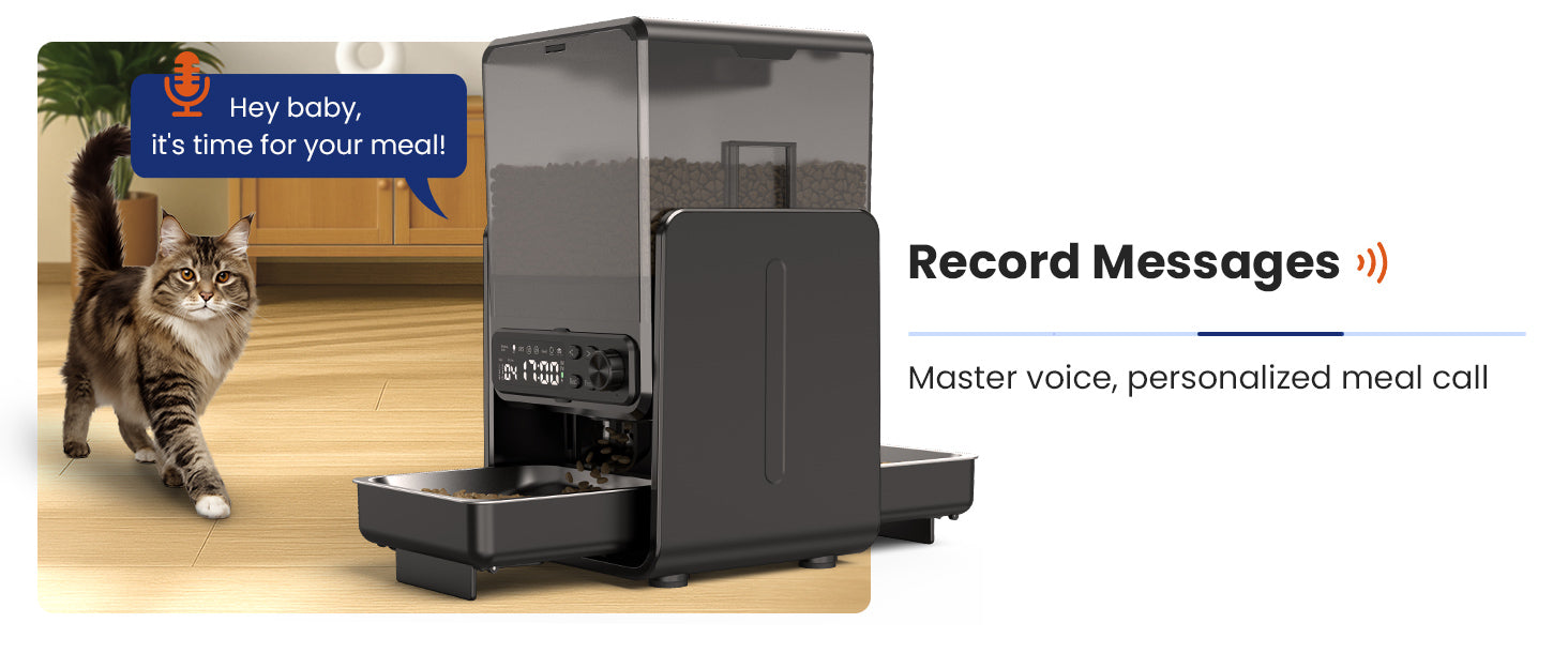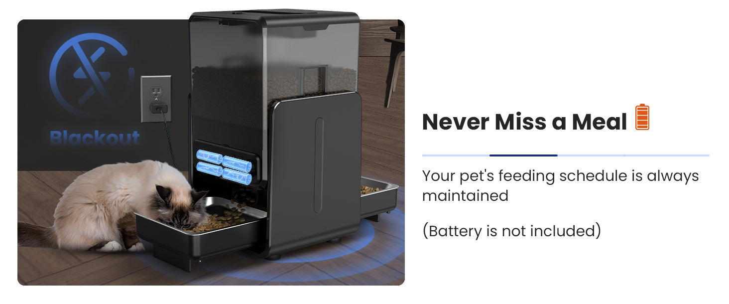 - Dual Power for Peace of Mind: Stay worry-free with dual power- adapter and 4 AA batteries (not included) with automatic switch-over during outages. 45-day battery backup ensures reliability. Record a 10-second custom meal call to comfort your pets and build a stronger bond