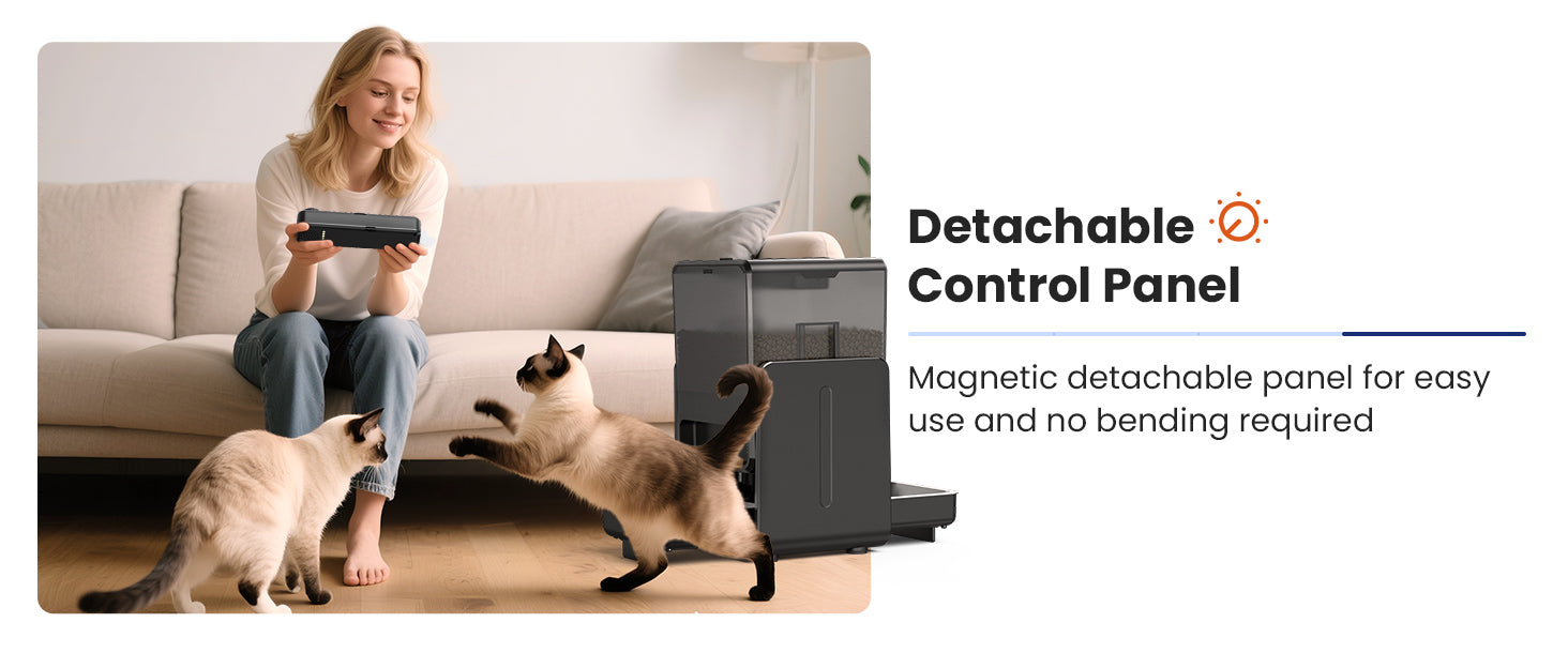 - Easy Access with Detachable Magnetic Panel: The CityFlee cat food dispenser features a magnetic control panel for easy access—no need to bend down or crouch when setting meal plans. A practical design for seniors or busy pet parents that simplifies feeding and enhances comfort