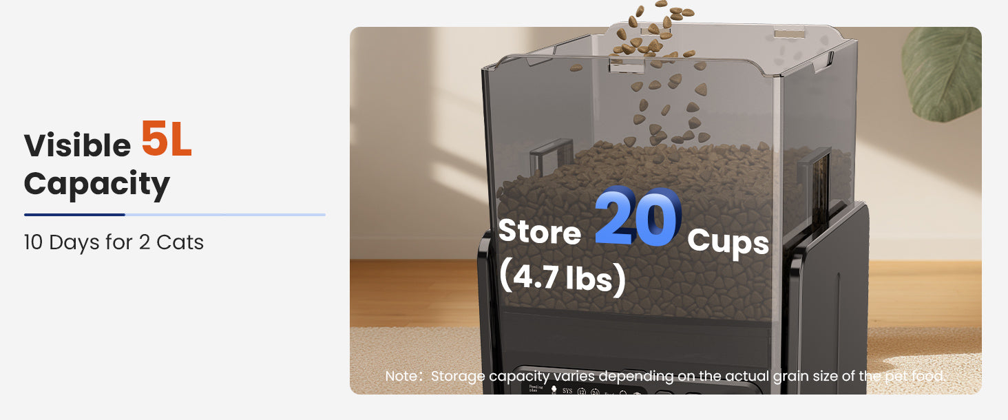 - 5L Capacity for Short Trips: Holds up to 5L (20 cups) of dry food - enough for two adult cats for 10–15 days. The transparent tank makes it easy to monitor and refill. A built-in desiccant keeps food fresh, while the secure lid prevents spills and overeating when you're away