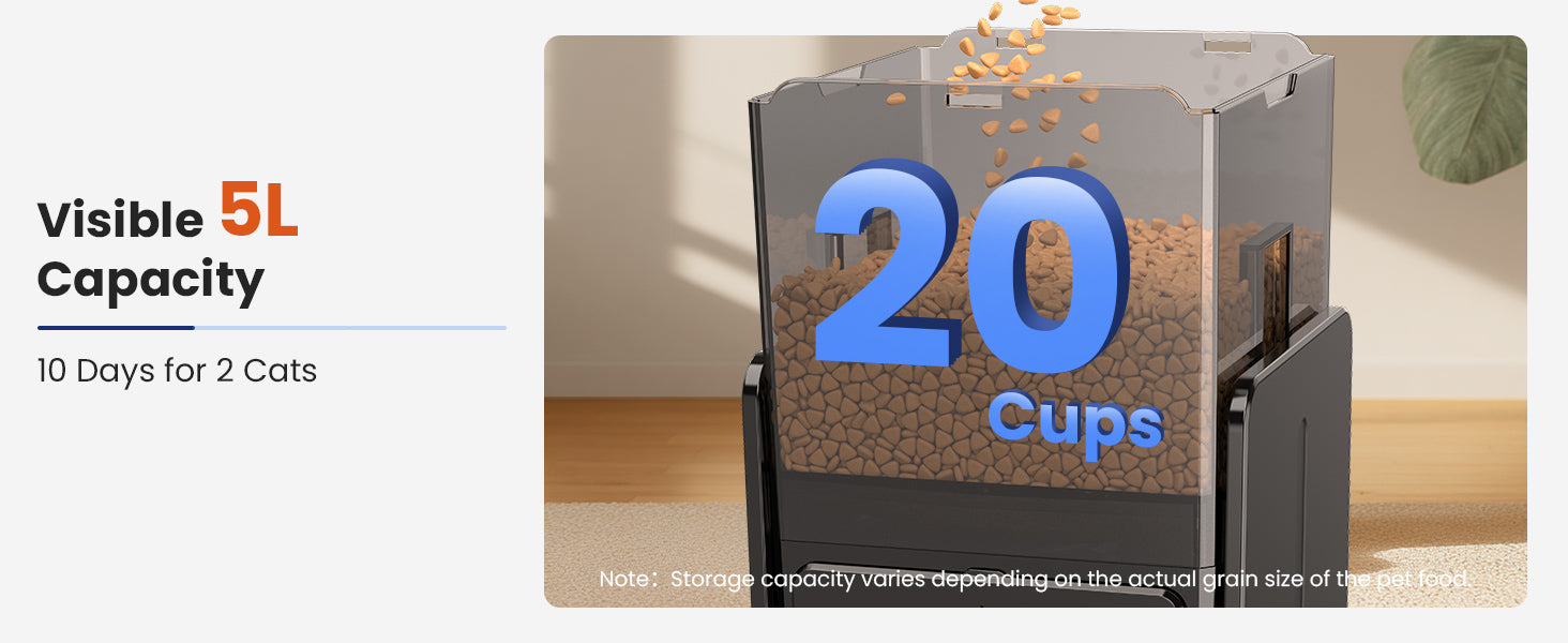 - 5L Capacity for Short Trips: Holds up to 5L (20 cups) of dry food - enough for two adult cats for 10–15 days. The transparent tank makes it easy to monitor and refill. A built-in desiccant keeps food fresh, while the secure lid prevents spills and overeating when you're away