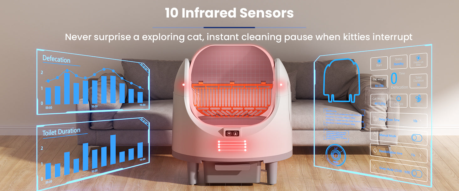 - Anti-Pinch Protection for Worry-Free Operation: Equipped with infrared and weight sensors, the cat litter box automatically pauses cleaning when your cat is nearby or inside. This ensures safety and prevents any risk of injury, giving you peace of mind with every use