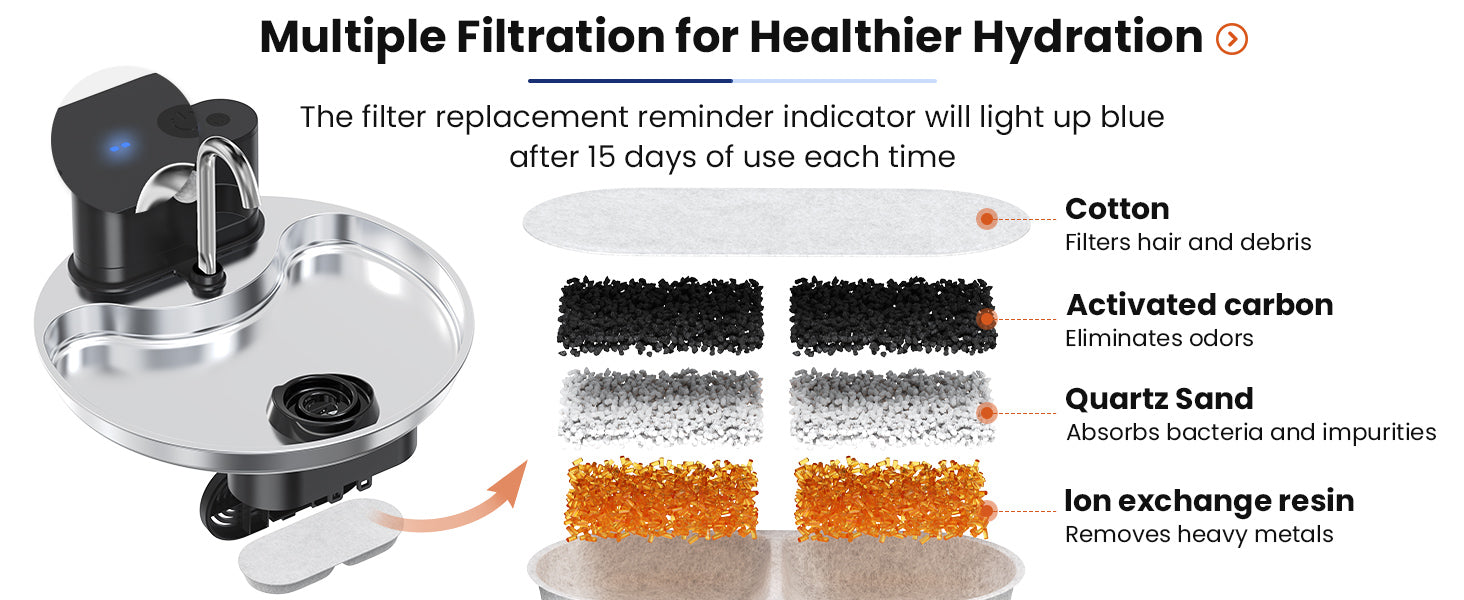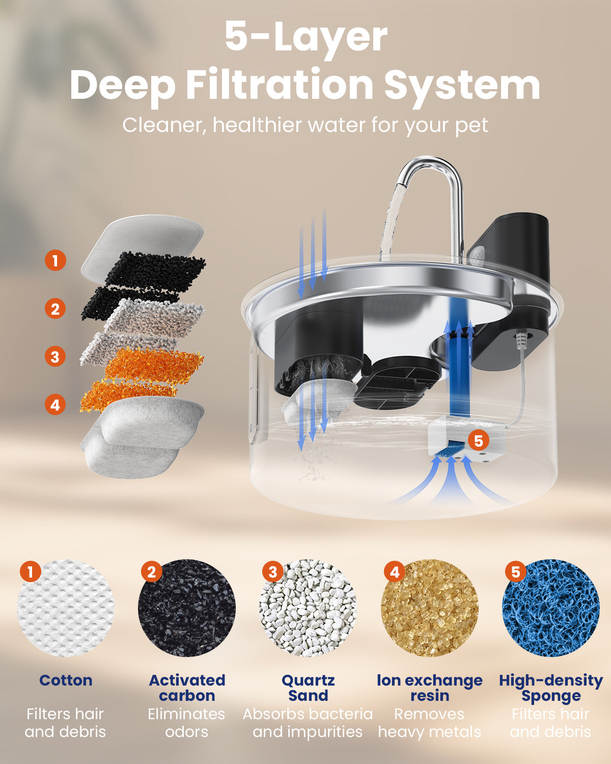 - Multi-Layer Filtration System: Five-layer filter with non-woven fabric, sponge, activated carbon, quartz sand, and ion exchange resin helps capture hair, dust, and debris; keeps water fresh-tasting to encourage your pets to drink more