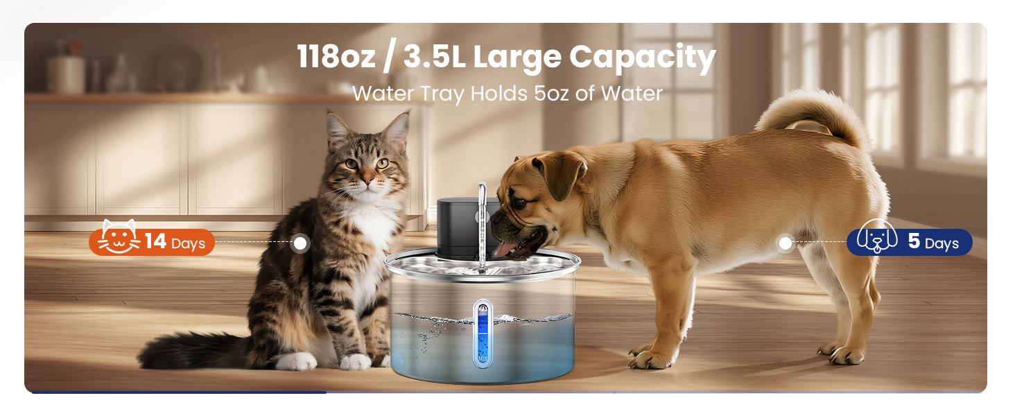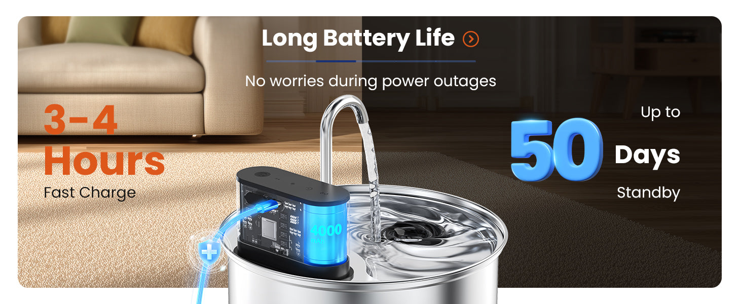 - Long-Lasting Battery Life: The pet water fountain features a 4000 mAh battery that charges in three to four hours and provides up to fifty days of use on a single charge; its 3.5 L capacity reduces frequent refills, giving you peace of mind during power outages or short trips