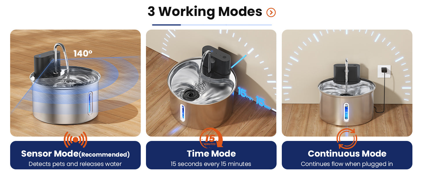 - Three Water Flow Modes: Sensor mode detects pets within a 140-degree range and 39–59 inches, starting water flow automatically; timer mode runs water for 15 seconds every 15 minutes; continuous mode keeps water flowing when plugged in, ensuring pets always have fresh water