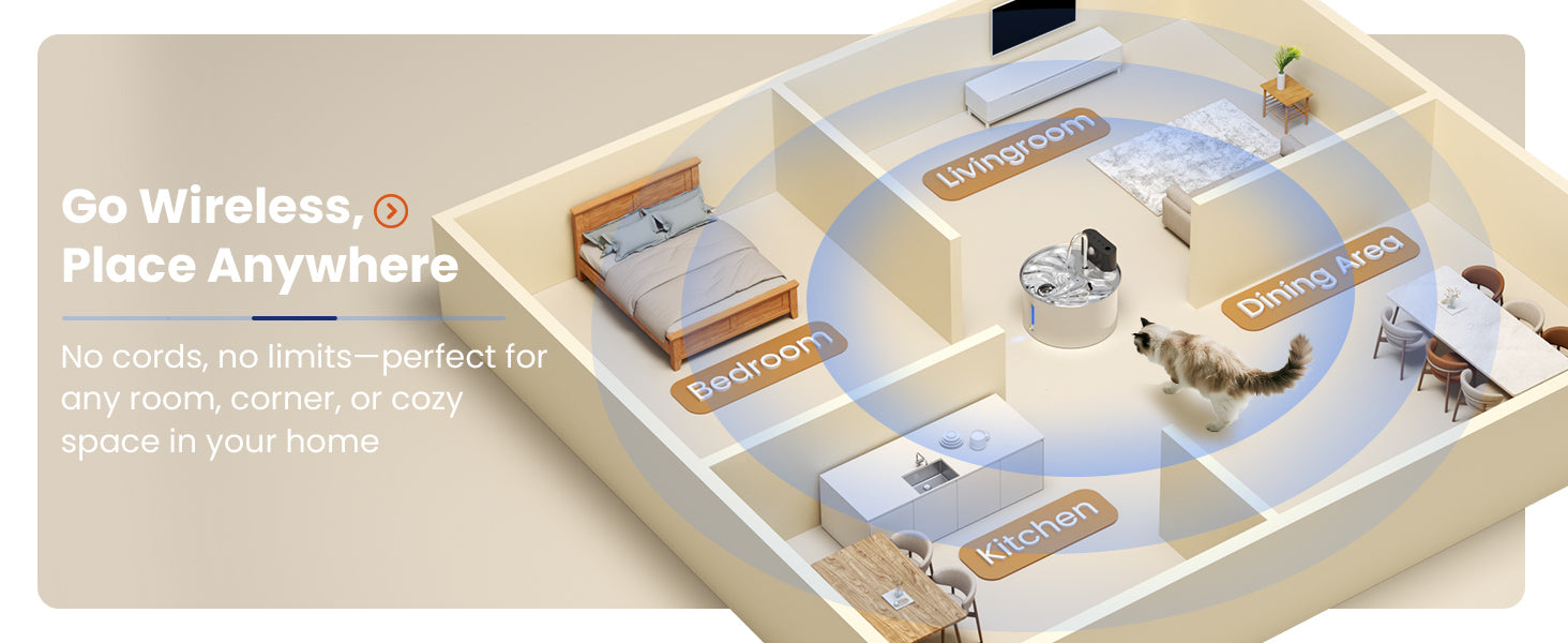 - Wireless Safety Design: Cordless and rechargeable cat water fountain prevents pets from chewing wires and eliminates tripping hazards; can be moved and placed anywhere in your home and encourages your furry friends to drink more