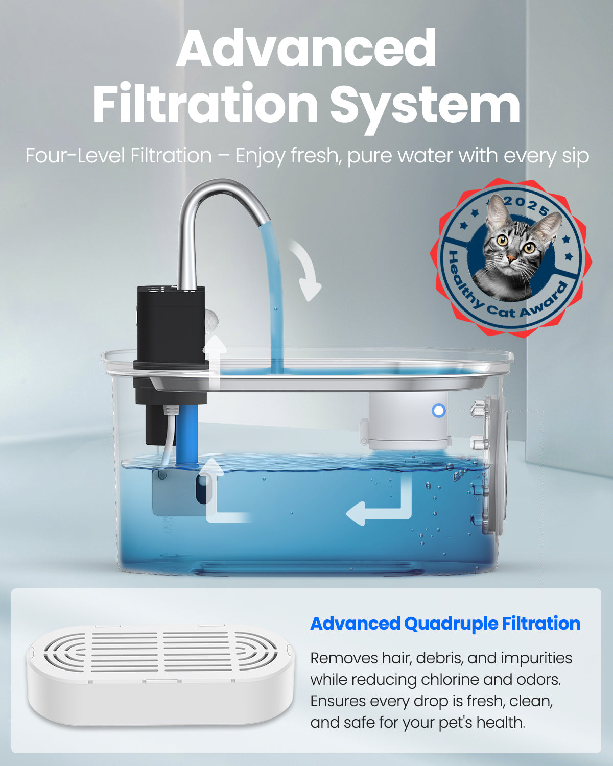 - Advanced Quadruple Filtration System – This water fountain for cats to drink features a four-layer filtration system(nonwoven fabric/activated carbon/foam) that removes impurities, improves taste, and ensures clean, fresh and healthy hydration for your furry friends