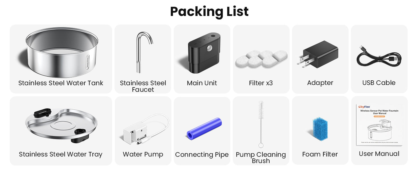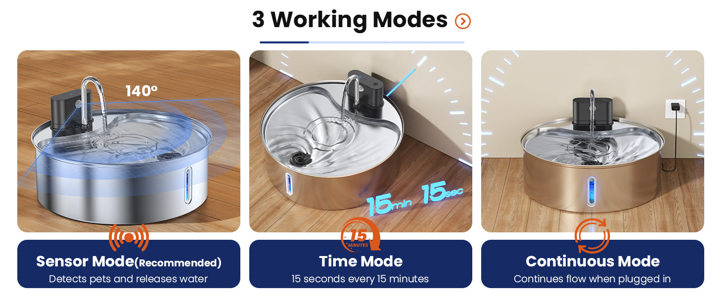 - Three Water Flow Modes: Sensor mode detects pets within a 140-degree range and 39–59 inches, starting water flow automatically; timer mode runs water for 15 seconds every 15 minutes; continuous mode keeps water flowing when plugged in, ensuring pets always have fresh water