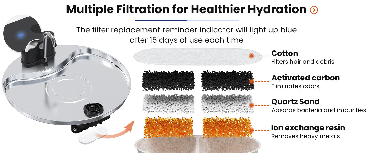 - Multi-Layer Filtration System: Five-layer filter with non-woven fabric, sponge, activated carbon, quartz sand, and ion exchange resin helps capture hair, dust, and debris; keeps water fresh-tasting to encourage your pets to drink more